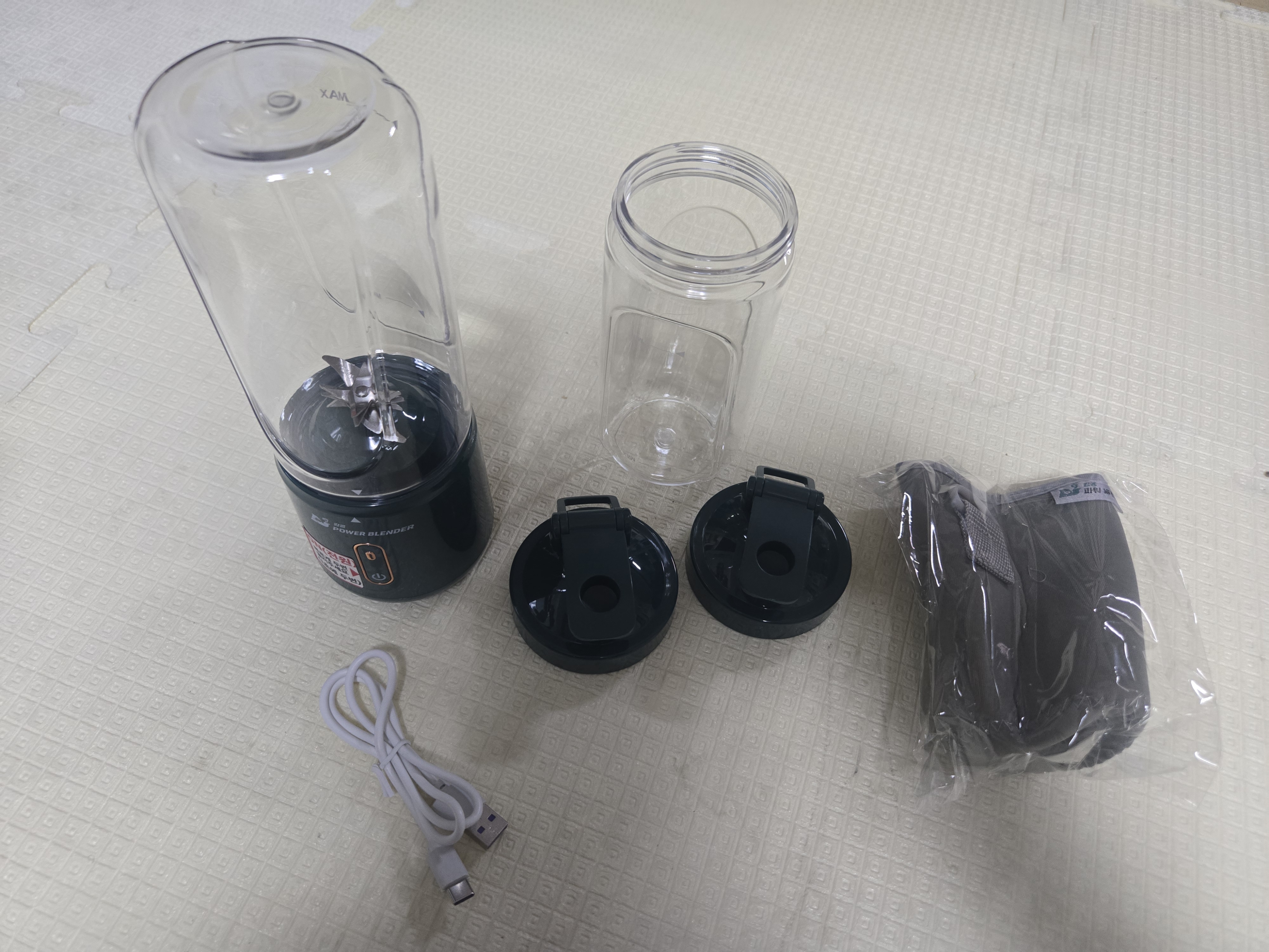구성품으로는 본체 1개, 투명 텀블러(용기) 2개, 텀블러 뚜껑2개, 보냉주머니1개, 충전케이블1개